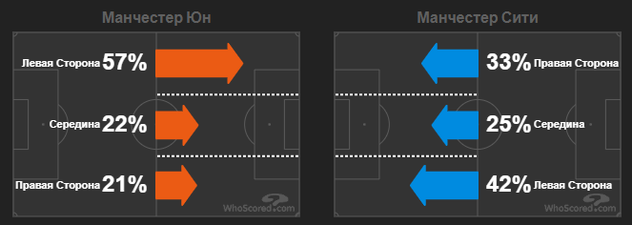 В конструктивной фазе игры обе команды заваливались на свой левый фланг. Особенно это проявлялось у команды Солскьяера. Показатель активности в 57% для одной вертикальной зоны это своего рода аномалия. Подобные цифры встречаются крайне редко. Касательно горизонтальных зон, то 17% против 36% действий в финальной трети поля красноречиво характеризуют картину матча.