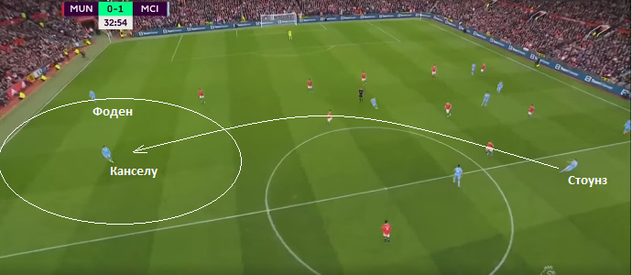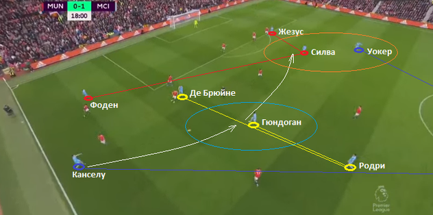 Обратите внимание на скриншот выше. На нем четко видно, как гости сами создавали себе пространство на половине поля соперника. Одна из условных "восьмерок", в данном случае — Де Брюйне, поднималась выше, держа в низкой позиции центрального хавбека МЮ. Соответственно, Гюндоган имел достаточно свободного пространства для качественного и оперативного перевода мяча путем средних передач. Канселу отдал на Илкая, а тот отпасовал на заполнившего свободную зону в полупространстве — Силву.
