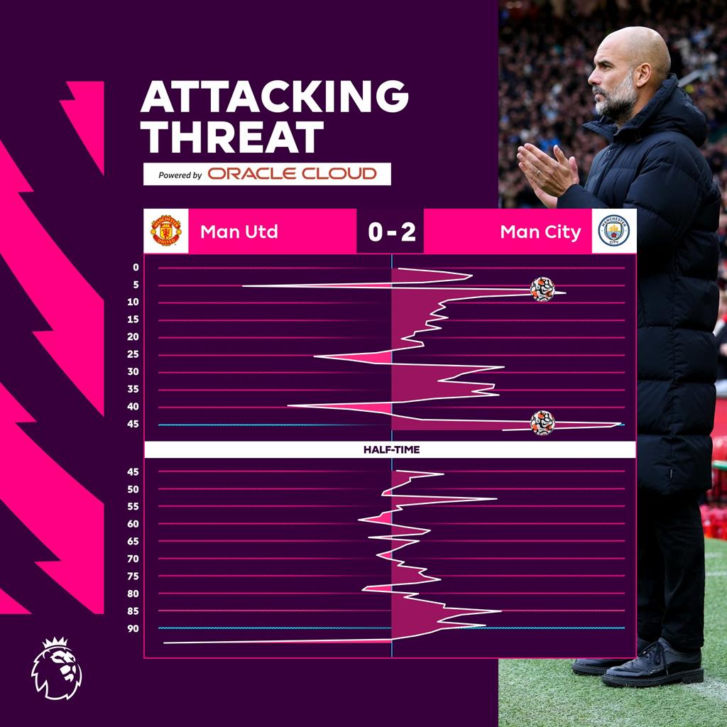 Что же мы увидели? А увидели мы абсолютное доминирование со стороны Манчестер Сити, в чем можно наглядно убедиться по графику атакующей угрозы по ходу матча в исполнении обеих команд, который нам любезно предоставила пресс-служба английской Премьер-лиги. Манчестер Юнайтед просто отсутствовал на поле, показав на данном этапе огромную разницу в классе и командной игре в пользу "горожан".