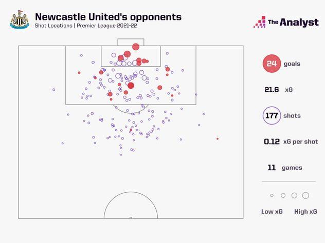 Только Норвич Сити (26) пропустил больше голов, чем Ньюкасл (24) в этом сезоне. Соперники Сорок набили 21,6xG и нанесли 177 ударов по воротам.