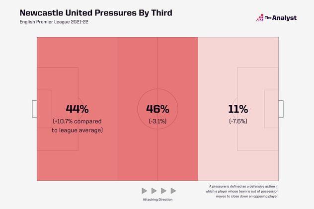 Разбив командный прессинг на трети поля, мы обнаружим, что у Ньюкасла самая высокая доля давления в своей оборонительной трети и самая низкая доля в атакующей трети среди всех команд Премьер-лиги.