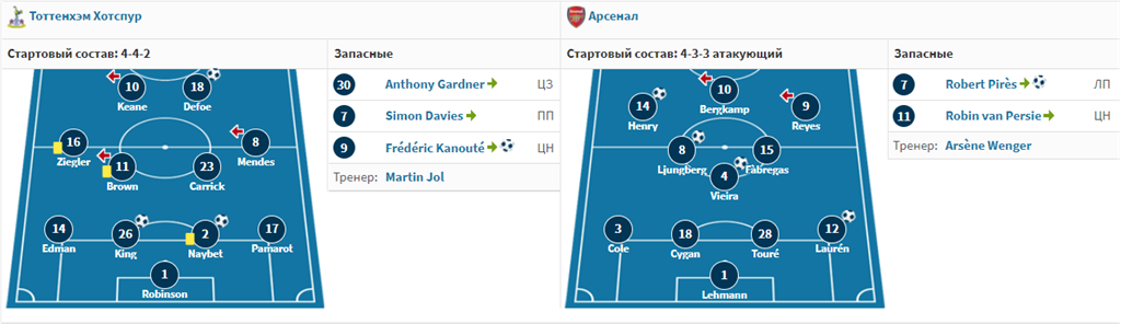 Голы: Найбет, 37, Дефо, 61, Кинг, 74, Кануте, 88 – Анри, 45, Лаурен, 55 (пен.), Виейра, 60, Юнгберг, 69, Пирес, 81