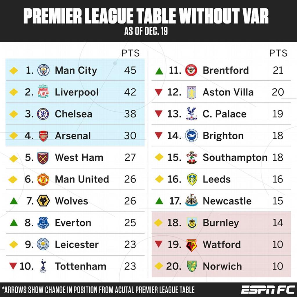 В случае с Английской Премьер-Лигой система ВАР не так сильно повлияла на распределение место в турнирной таблице. К примеру, первая шестерка осталась без изменений, а вот в борьбе за выживание ВАР сослужила недобрую службу Ньюкаслу.