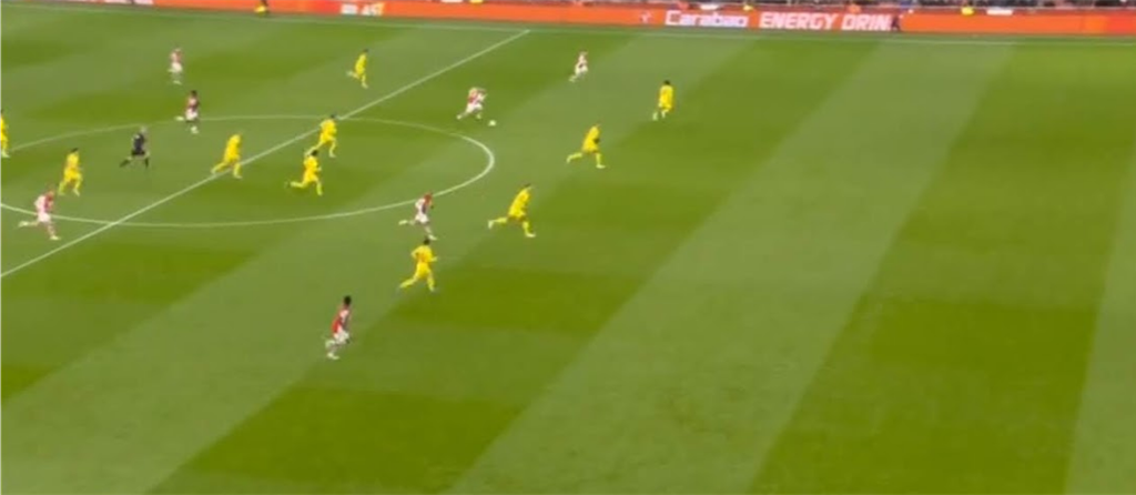 Хозяевам непросто было выдерживать темп и интенсивность Ливерпуля. Для выхода из прессинга структура билд-апа Арсенала 2-3 (пара центрбеков – пара фулбеков и опорник) часто разбавлялась появлением во второй линии Эдегора. Норвежец был очень активен и старался связывать переход команды из одной фазы в другую.