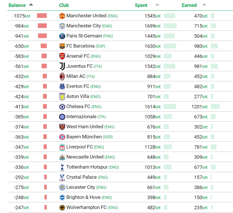 Возглавляет данный рейтинг Манчестер Юнайтед, который потратил на подписание новых футболистов 1,545 миллиарда евро, тогда как заработали всего 470 миллионов евро. Таким образом, их баланс ушел в минус на 1,075 миллиарда евро.