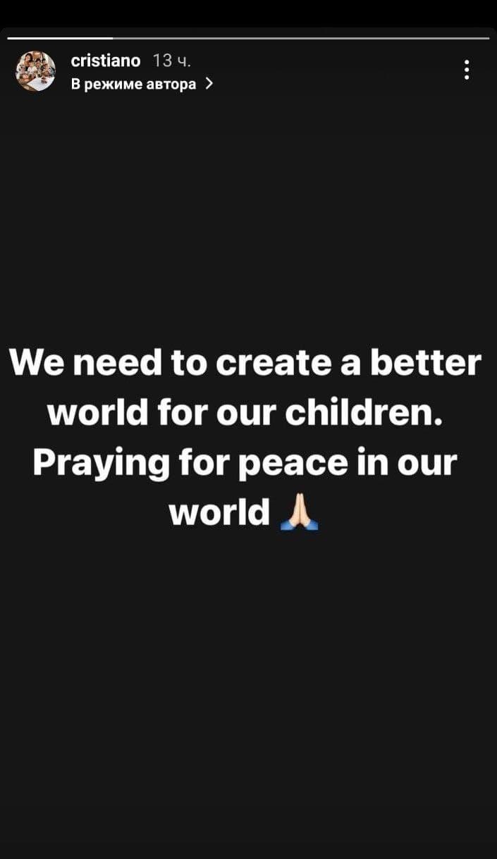 "Ми повинні створити кращій світ для наших дітей. Молимось за мир", — написав Роналду в сторіс в Instagram.
