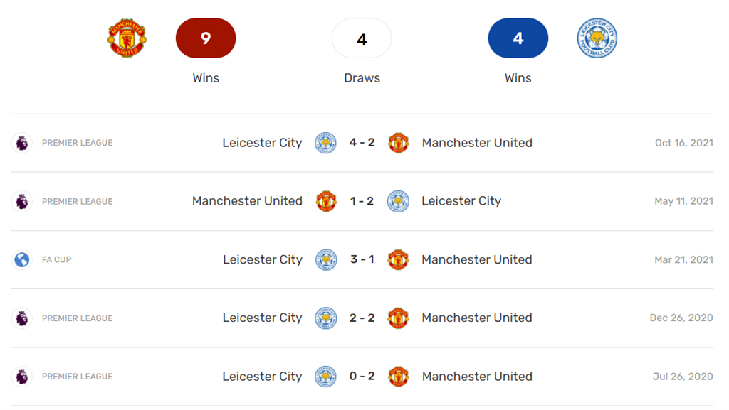 Якщо дивитися на результати останніх очних матчів, то Лестер Сіті традиційно є важким суперником для Манчестер Юнайтед. Останні три зустрічі цих команд, які відбулися 2021 року, завершилися перемогами "лисиць". Але тоді і сам Лестер був сильнішим і навіть поповнив свою трофейну кімнату виграними Кубком Англії та Суперкубком Англії.