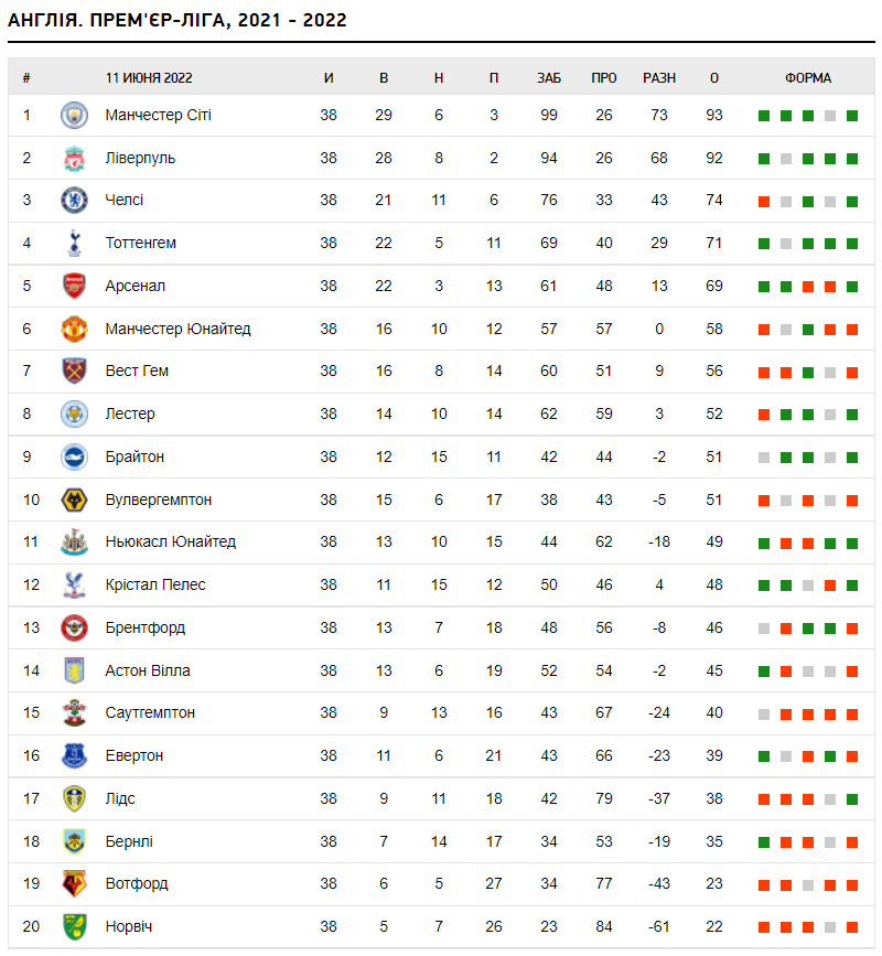 Англійська Прем'єр-ліга підбиває підсумки сезону-2021/22, за підсумками якого Манчестер Сіті став чемпіоном, а Бернлі, Вотфорд та Норвіч залишили вищий дивізіон.