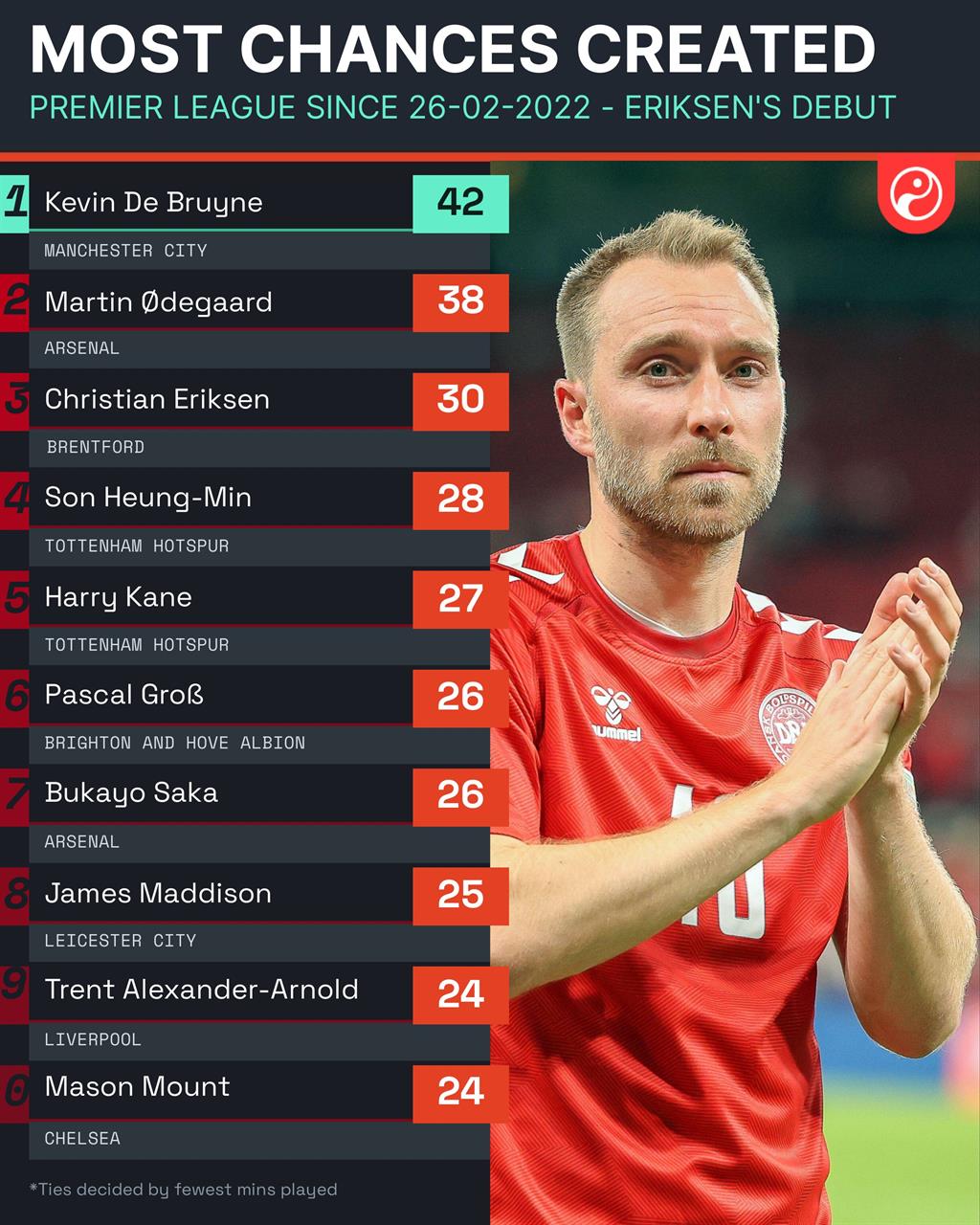 З моменту дебюту за Брентфорд, датський футболіст зміг створити 30 гольових моментів для своїх партнерів — це третій результат за цей період в Англійській Прем'єр-Лізі.