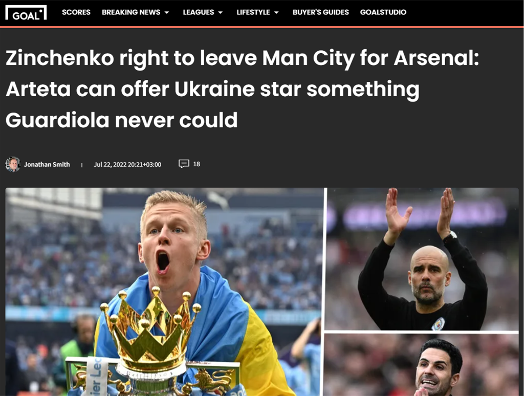 Стаття під назвою: "Зінченко має право залишити Ман Сіті заради Арсеналу: Артета може запропонувати зірці України те, чого Гвардіола ніколи не міг".