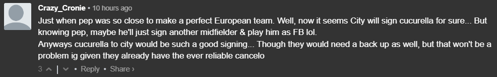 "Саме тоді [піде Зінченко], коли Пеп був настільки близький до створення ідеальної європейської команди. Ну, тепер здається, що Сіті точно підпише Кукурелью... Але, знаючи Пепа, можливо, він просто підпише ще одного півзахисника і буде награвати його у якості лівого захисника, лол. У будь-якому випадку Кукурелья в Сіті було б таким гарним підписанням... Хоча їм також знадобилася б підтримка, але це не буде проблемою, якщо врахувати, що вони вже мають надійного Канселу", — пише читач Goal з ніком Crazy_Cronie.