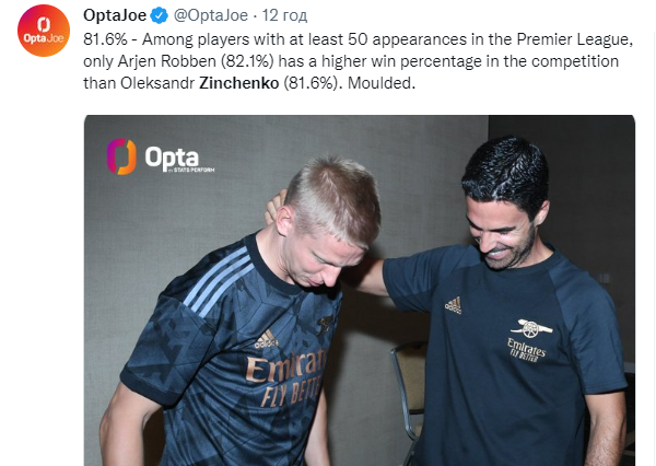 "81,6% – Серед гравців, які провели принаймні 50 матчів у Прем’єр-лізі, лише Ар’єн Роббен (82,1 %) має вищий відсоток перемог у змаганнях, ніж Олександр Зінченко (81,6 %)".