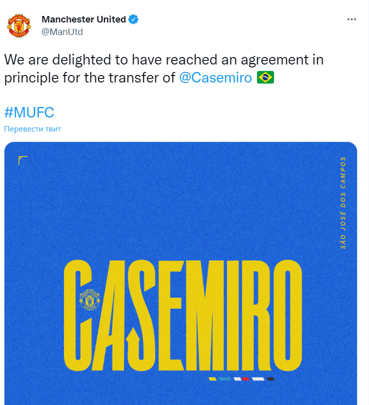 Бразильський півзахисник Каземіро перебрався з Реала до Манчестер Юнайтед. Про це офіційно оголосила пресслужба "червоних дияволів".