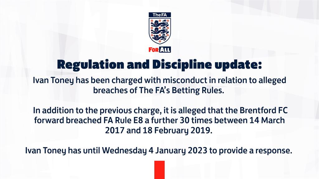 Нападник та лідер Брентфорда Айвен Тоуні у листопаді був звинувачений футбольною асоціацією Англії в порушенні правил ставок.