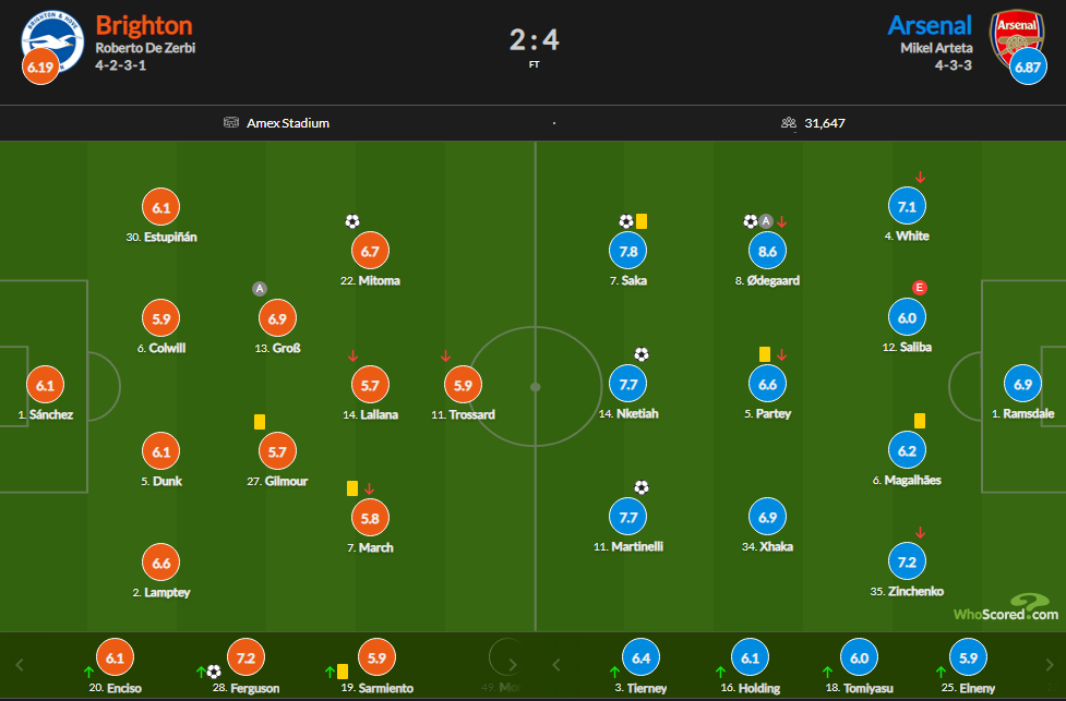 У рамках 18 туру англійської Прем'єр-ліги лондонський Арсенал у гостях здолав Брайтон (2:4).