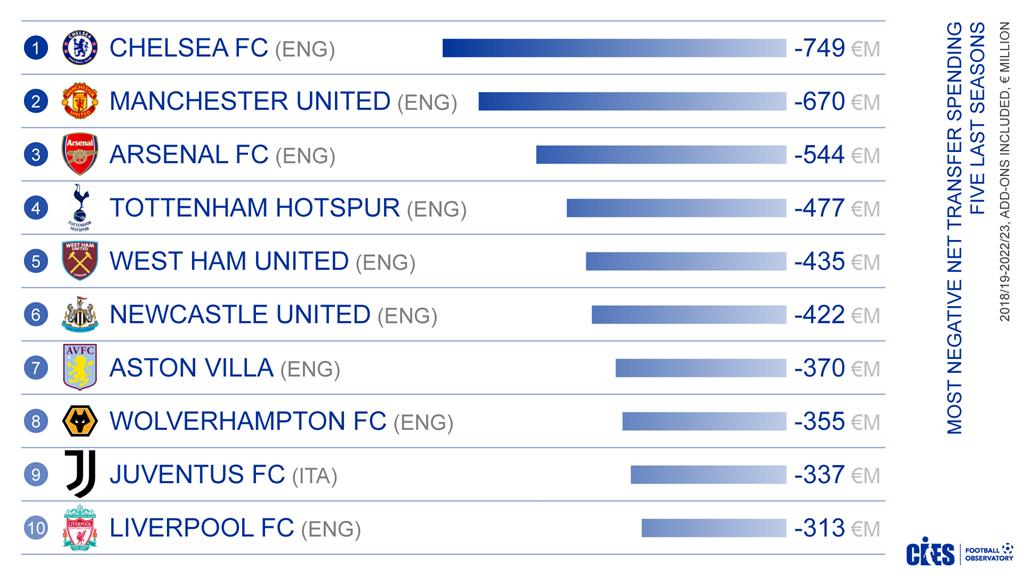Перше місце у списку займає лондонський Челсі. Їх негативні виплати складають — 749 мільйонів євро. Другий — Манчестер Юнайтед з мінусовим бюджетом у — 670 мільйонів євро. Трійку замикає Арсенал — 544 мільйони євро. Ювентус — єдиний клуб не з АПЛ, посів дев'яте місце з — 337 мільйонами.