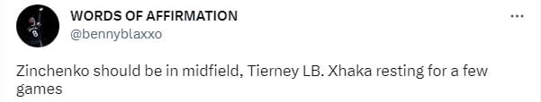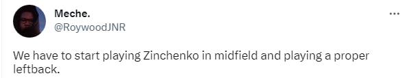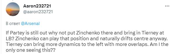 "Якщо Парті все ще недоступний, чому б не ставити у півзахист Зінченка, а Тірні – ліворуч у захисті? Зінченко може грати на цій позиції і він все одно зміщується до центру. Тірні може привнести більше динаміки зліва і робити більше забігань. Я один це бачу?".