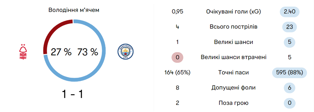 Але футбольні закони далекі від такого поняття, як "справедливість", якщо брати до уваги стилістичну перевагу однієї з команд протягом усієї гри. Ніхто б і не згадав, як Ерлінг Голанд не реалізував свої небезпечні моменти, перебуваючи буквально за кілька метрів від воріт Ноттінгема, якби суперник наприкінці не зрівняв рахунок своїм єдиним ударом у площину воріт Едерсона за весь матч (а всього спроб ударів у "лісників" було чотири).