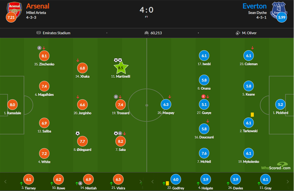 У перенесеному поєдинку сьомого туру англійської Прем'єр-ліги лондонський Арсенал розгромив Евертон з рахунком 4:0, а українець Олександр Зінченко віддав асист у моменті з голом Букайо Сака та взяв участь у трьох забитих м'ячах своєї команди.