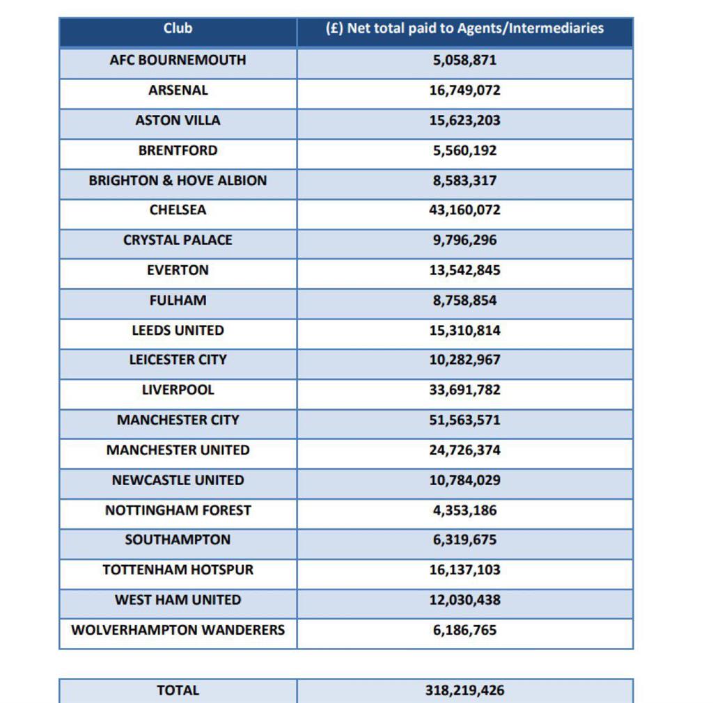 Футбольна асоціація Англії опублікувала список гонорарів агентам клубів елітного дивізіону за рік.
