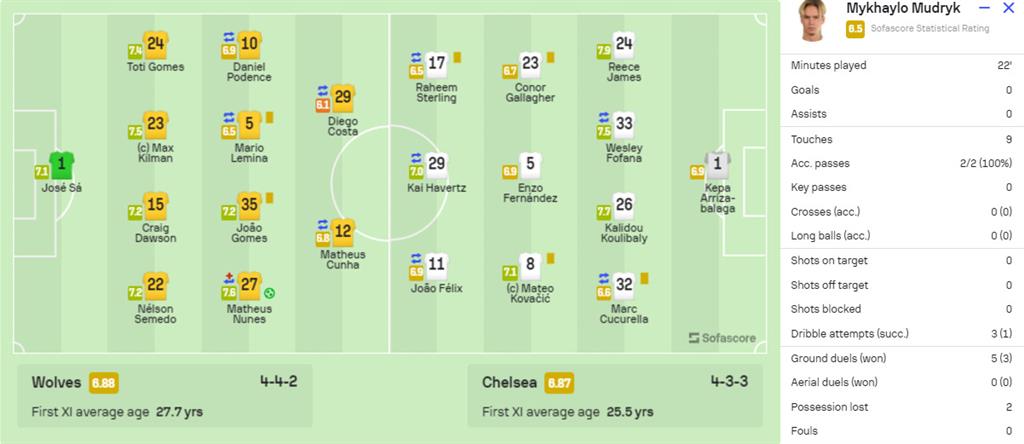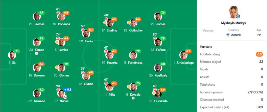 Оцінки Михайла Мудрика за матч проти Вулвергемптона