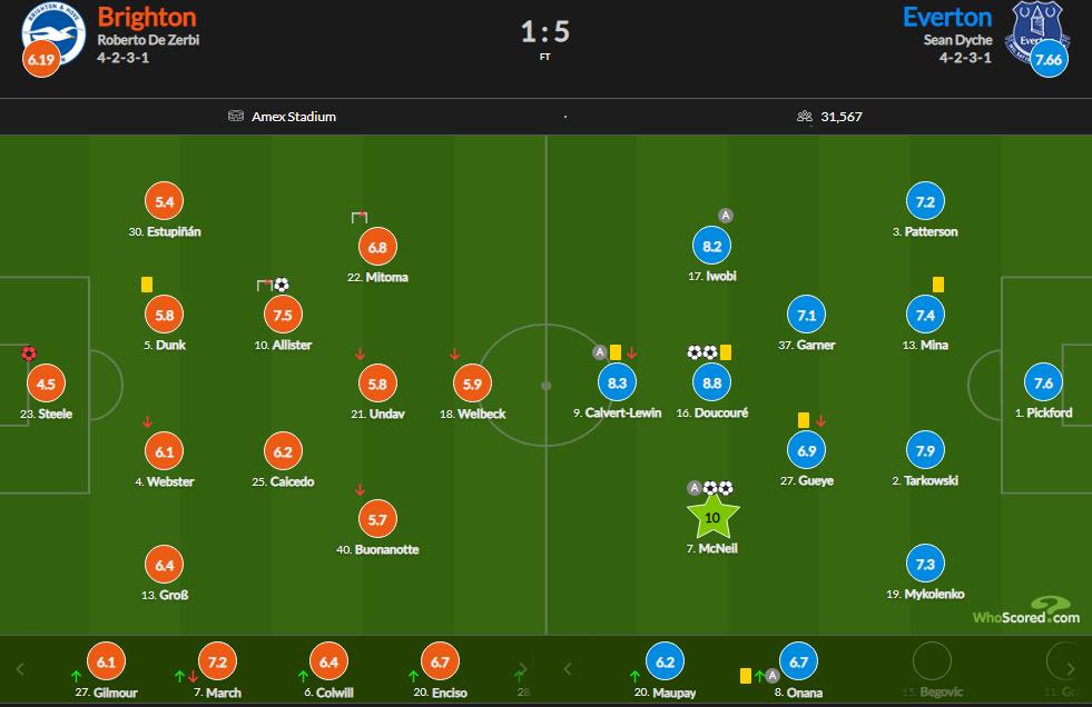 Евертон у поєдинку 35 туру англійської Прем'єр-ліги в гостях розгромив Брайтон (5:1).