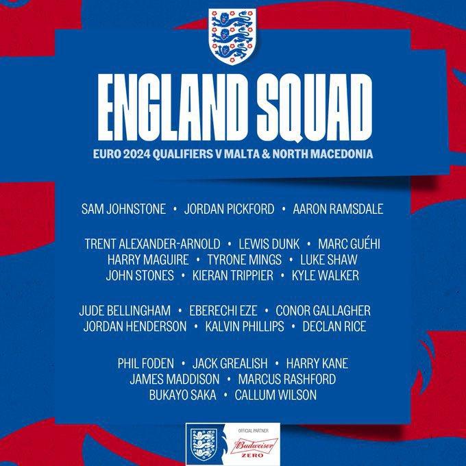 Гарет Саутгейт оголосив заявку на матчі відбору до чемпіонату Європи 2024 року проти Мальти та Македонії.
