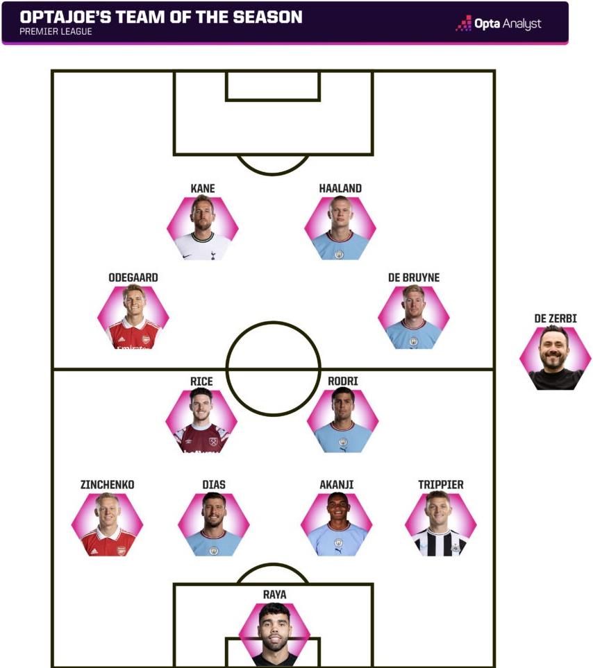 Аналітично-статистичний портал Opta Sports на своєму сайті опублікував символічну збірну англійської Прем'єр-ліги за підсумками сезону-2022/23.