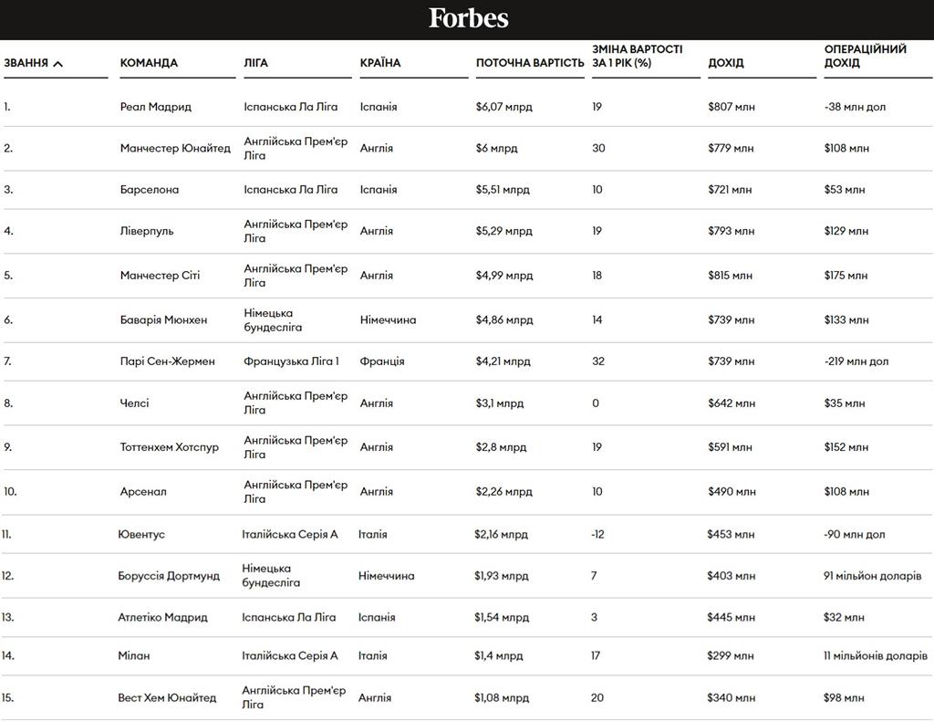 Лідерство в цьому списку традиційно зберігає мадридський Реал, вартість якого оцінюється в 6,07 мільярда доларів США (+19% порівняно з минулим роком), тоді як Манчестер Юнайтед розташувався на другому місці з поточною вартістю 6 млрд доларів, що на 30% більше, ніж рік тому.
