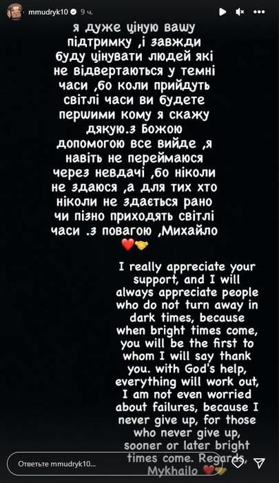 З божою допомогою все вийде. Я навіть не переймаюся через невдачі, бо ніколи не здаюся. А для тих, хто ніколи не здається, рано чи пізно приходять світлі часи. З повагою, Михайло", – написав Мудрик.