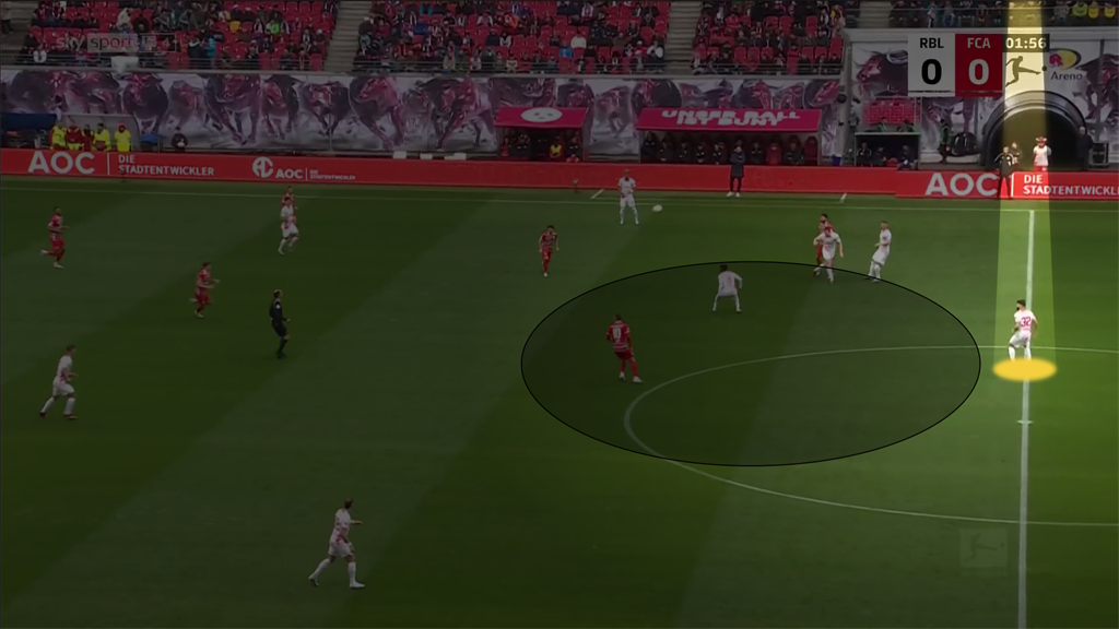 Тепер про виступи безпосередньо в обороні. Головною чеснотою є вміння робити впевнений крок вперед. Хорватський центрбек здатен вибрати правильну позицію та розрахувати таймінг таким чином, щоб встигнути вчасно вийти на суперника та вступити у відбір або зуміти перехопити м’яч і не дати розвинути атаку. Це важливо, враховуючи те, що Лейпциг та Манчестер Сіті переважно грають із високою лінією захисту, де вміння добре компенсувати простір та зіграти у перехідних фазах виходить на перший план.