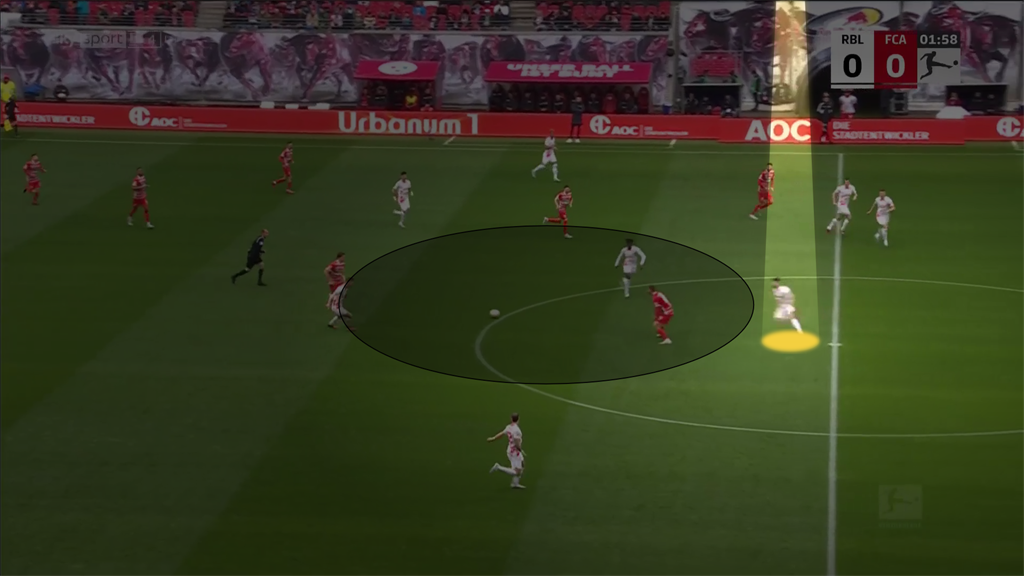 Під пресингом суперника він не завжди виглядає впевнено, може програти силову дуель та допустити втрату, над цим потрібно ще трішки попрацювати. Проте в цілому на м’ячі він виглядає непогано, в нього хороший перший дотик та передача, він вміє добре виходити з-під тиску. Ось, наприклад, його комбінація з Крістофером Нкунку у поєдинку проти Бохума. Побачив намір відкривання партнера у зоні завершення, віддав чіткий довгий пас.