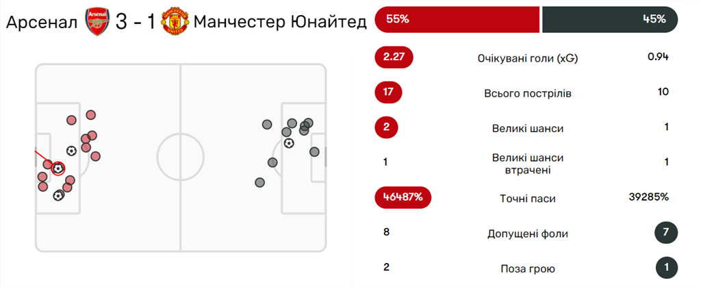 Арсенал зміг здобути перемогу завдяки двом голам у компенсований час, і, напевно, ці три очки є цілком справедливим результатом цього протистояння. Команда Мікеля Артети перевершувала принципового суперника в багатьох аспектах гри, але варто визнати, що "червоні дияволи" досить організовано вибудовували оборону і обмежували вільний простір домінуючому Арсеналу до тих пір, поки через травму Лісандро Мартінеса ми були змушені побачити у Юнайтед зв'язку центрбеків в обличчі Джонні Еванса і Гаррі Магвайра.