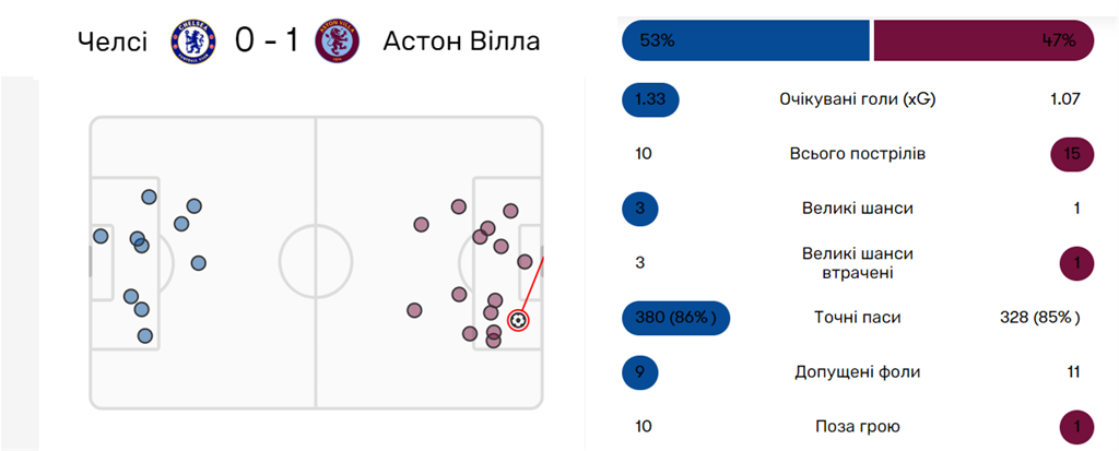 У поєдинку проти Астон Вілли гравці Челсі втратили три "big chancеs", а після прямого вилучення Мало Гюсто у другому таймі все для "синіх" фактично і закінчилося, а бірмінгемці вирвали мінімальну перемогу завдяки єдиному голу Оллі Воткінса.