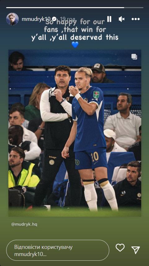 "Так радий за наших фанів. Ця перемога для вас, ви заслуговуєте цього", — написав Михайло Мудрик в своєму Instagram.