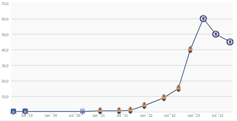 Transfermarkt оновив трансферну вартість деяких футболістів Англійської Прем'єр-ліги. Зокрема, стала відома нова вартість вінгера Челсі Михайла Мудрика.