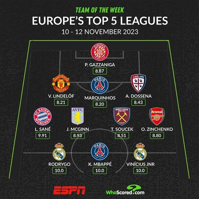 Статистичний портал WhoScored представив символічну збірну тижня за підсумками останніх матчів у топ-5 лігах Європи.