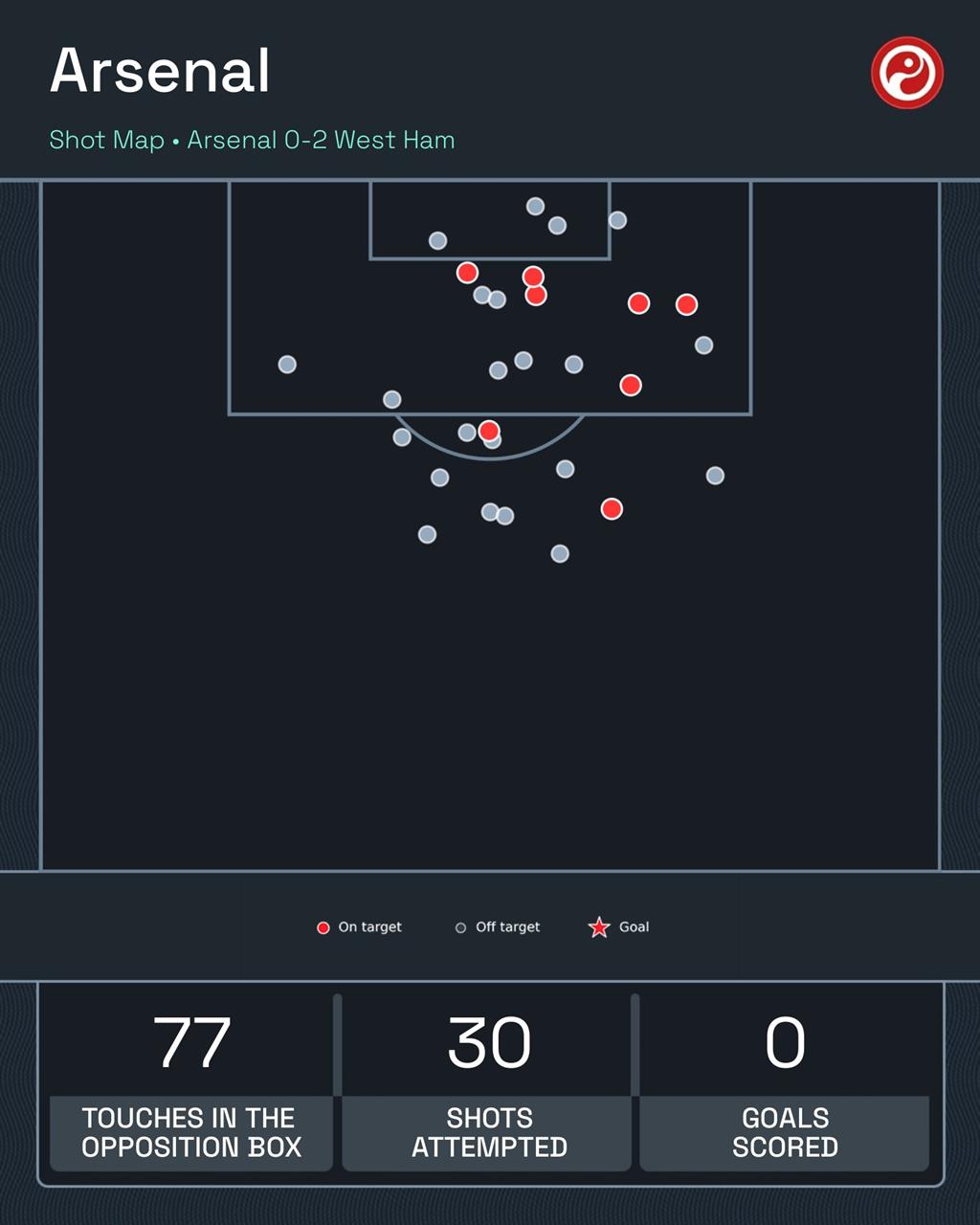 Протягом усього матчу команда Мікеля Артети 77 разів торкалася м'яча у штрафному майданчику Вест Гема, що є найбільшим показником в історії АПЛ для команди в одному матчі, якій так і не вдалося забити гол (дані щодо цього показника почали документувати з сезону-2008/09).