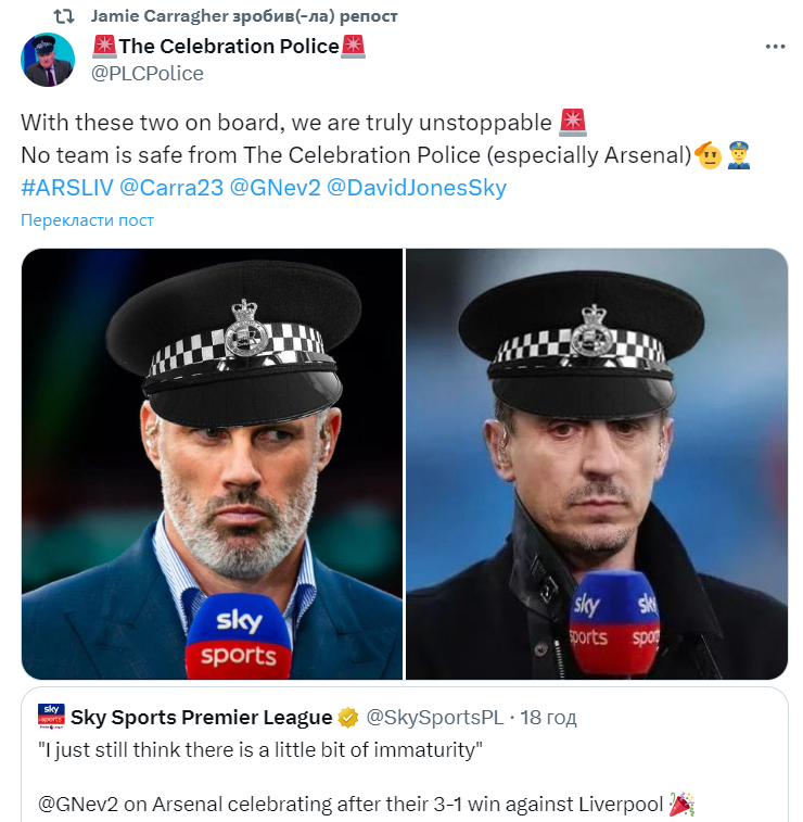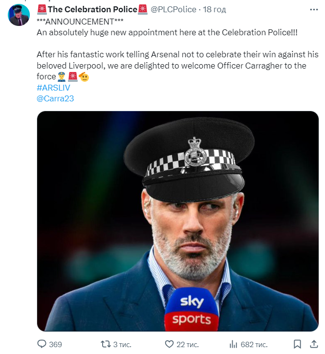 "Абсолютно велике призначення! Завдяки фантастичній роботі, за підсумками якої він наказав Арсеналу не святкувати перемогу над його улюбленим Ліверпулем, ми раді вітати офіцера Джеймі Каррагера у наших рядах!👮♂️🚨🫡"