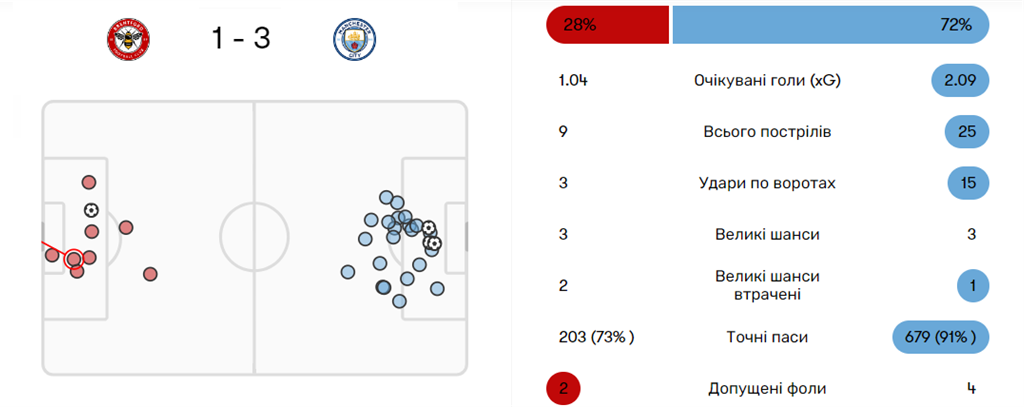 Нічия після першого тайму, однак, звісно, продовжуватися так до нескінченності не могло — з 15 ударів у площину Флеккен здійснив у результаті 12 сейвів, за що лінія оборони вже апріорі зобов'язана отримувати по шапці від свого воротаря. На жаль, який би "матч життя" голкіпер Брентфорда не проводив, за рахунок оформленного хет-трику багатьом запам'ятається саме Філ Фоден в якості MVP. Залишається лише здогадуватися, що було б, якби Піннок не "привіз" абсолютно непотрібний гол наприкінці першого тайму. А так – очевидна та заслужена перемога гравців Манчестер Сіті, які обійшлися лише легким шоком до перерви.