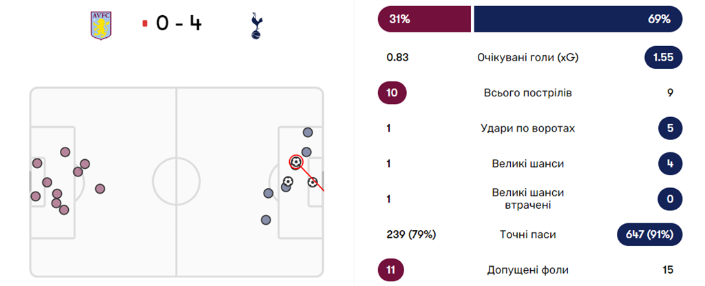 Тоттенгем — зовсім інша історія з приходом Анге Постекоглу на посаду головного тренера. "Шпори" знають свою кінцеву мету будівництва проєкту насамперед щодо стилю свого футболу і впевненими кроками до неї йдуть. Очікувано Тоттенгем грав проти Астон Вілли першим номером зі ставкою на контроль м'яча — він намагається це робити проти будь-якого суперника, але, щоб стримати "шпор", бірмінгемцям вистачило буквально на один тайм. Потім уже почалося справжнє побиття, знищення та місцями знущання з Астон Вілли по грі.
