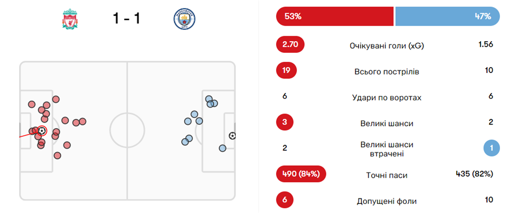 Але Гвардіола явно хотів би отримати більше у першому таймі, особливо з урахуванням того, що відбувалося на полі після перерви (наприклад, довелося змінювати через травму воротаря, а з тактичних міркувань — свого дуже незадоволеного лідера Кевіна Де Брюйне). По-перше, Ерлінг Голанд був абсолютно ніяким того вечора — як підсумок, легкий робочий день для Вірджила ван Дейка. По-друге, Ліверпуль повністю перехопив ініціативу у другому таймі та знаходив можливості виводити на забігання атакуючих гравців. Так Дарвін Нуньєс і заробив пенальті на 50-ій хвилині — дурна помилка голкіпера, адже уругваєць навмисно йшов підставлятися і ризиків пропустити гол у тому моменті майже не було.