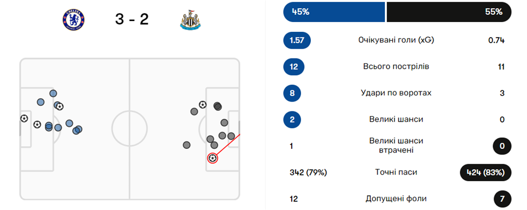 Так, Ньюкасл пропустив після якогось незрозумілого невдалого виносу, а після — несильного удару Палмера, за яким усі захисники "сорок" просто стояли і спостерігали — навряд чи там взагалі потрібен був дотик Ніко Джексона, бо, здається, м'яч все одно знайшов би ціль — ніхто не заважав. Челсі ж пропустив не менш безглуздо — якийсь невмілий і непотрібний "дриблінг" захисника "синіх" на своїй половині поля, втрата м'яча на рівному місці та колективне спостереження всією командою за тим, чи заб'є Ісак чи ні. Забив.