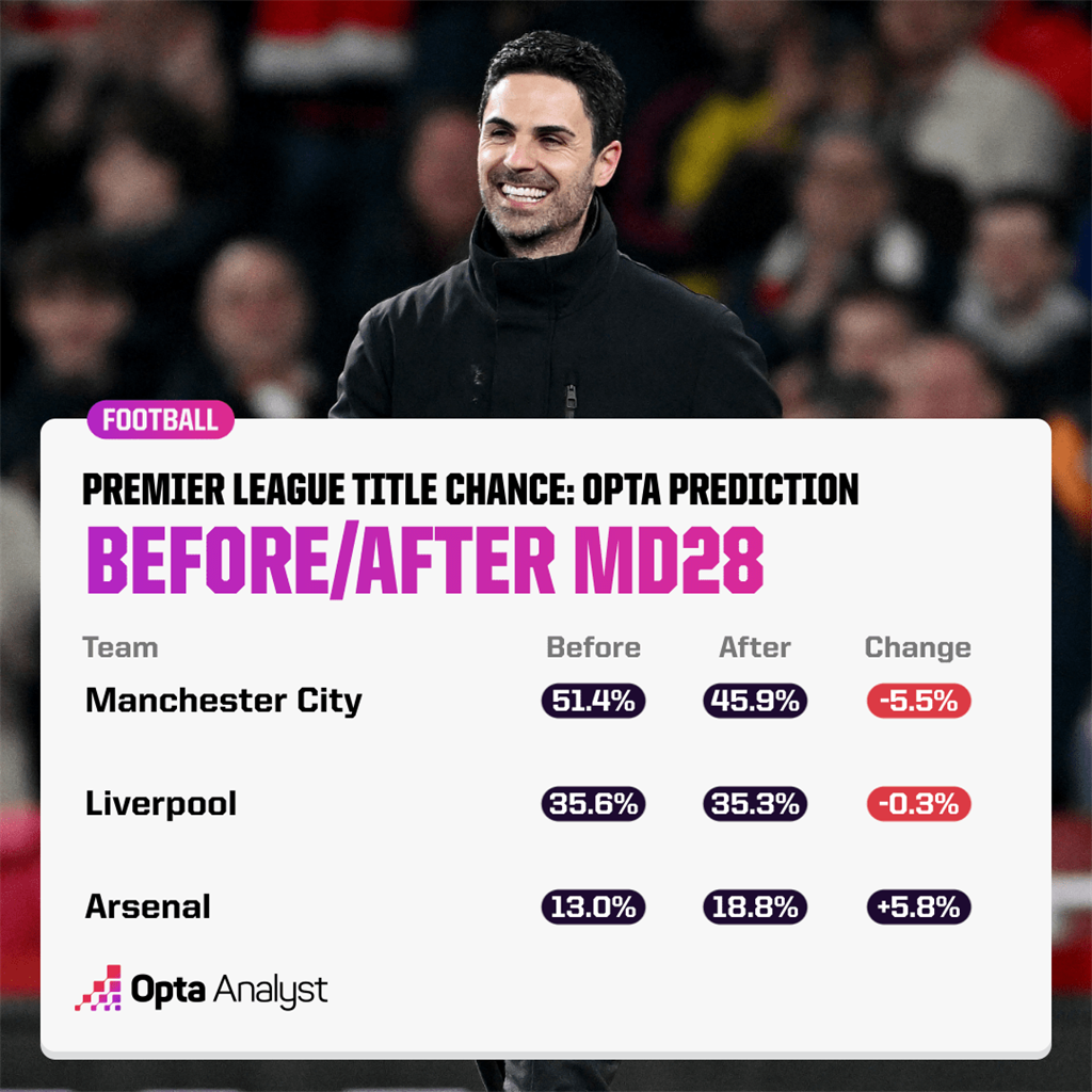 ЯК ЗМІНИЛИСЯ ШАНСИ НА ЧЕМПІОНСТВО АПЛ ПІСЛЯ 28 ТУРУ ЗА ВЕРСІЄЮ OPTA: