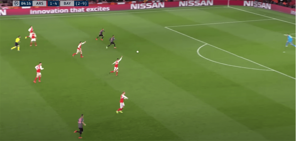 Арсенал, здавалося, здригнувся від пресингу команди Пепа Гвардіоли. Джоель Кемпбелл і Алексіс Санчес, які давали ширину, забезпечили невелику підстраховку для крайніх захисників Матьє Дебюші та Начо Монреаля, тоді як Франсіс Коклен грав у центрі поля із Санті Касорлою та Озілом. Арсенал міг би зрівнятися з Баварією з точки зору таланту, але не з точки зору витривалості, особливо без енергії Аарона Ремзі.