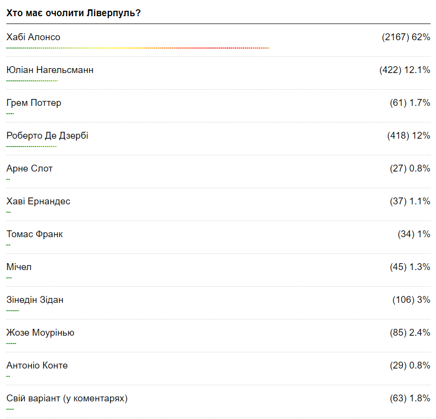 Таким чином, на питання "Хто має очолити Ліверпуль?" Арне Слот набрав всього 0,8% голосів серед усіх учасників опитування, що стало найменшим показником серед усіх запропонованих варіантів.
