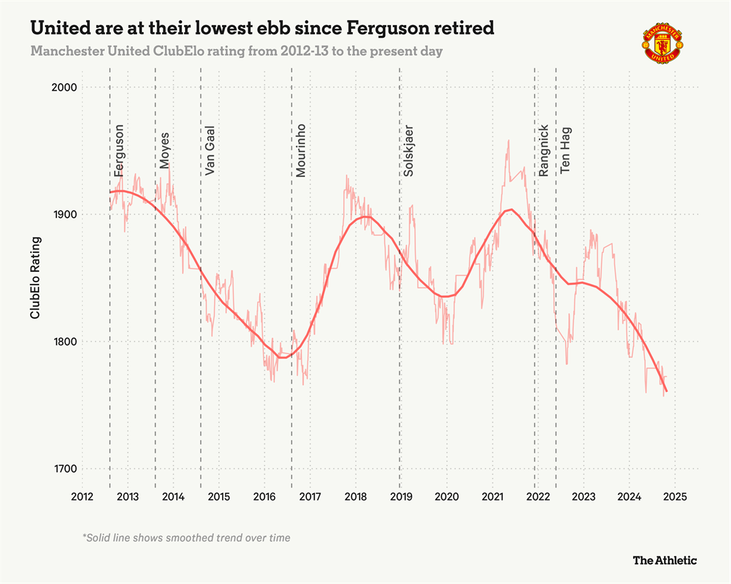 Нижче наведено графік рейтингу ClubElo Юнайтед — показник сили команди, що нараховує бали за кожен результат, з урахуванням якості суперника — який ілюструє спад клубу після ери Фергюсона.