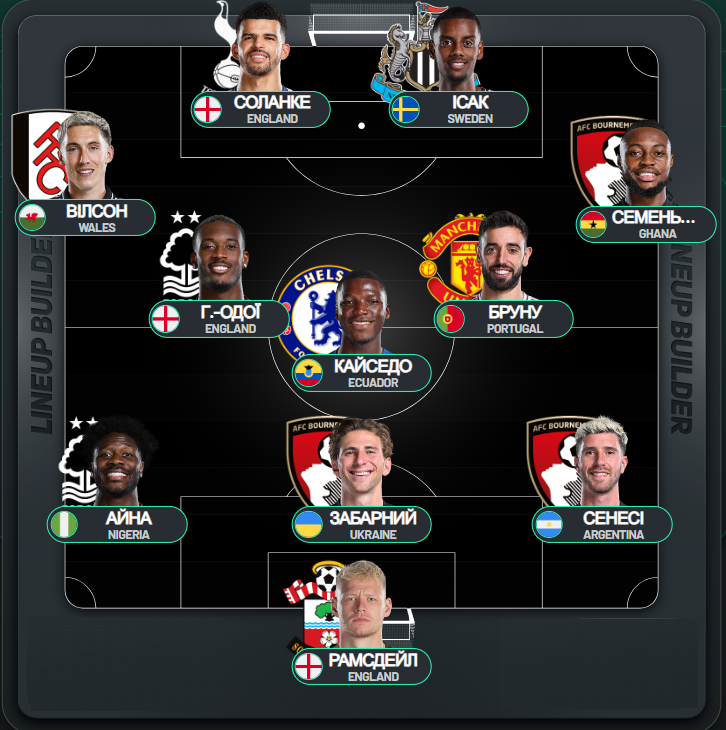 Брентфорд: Флеккен — Роерслев, Коллінз, Піннок, Ван ден Берг — Нергор, Янельт (Ярмолюк, 90) — Мбемо (Мі, 86), Дамсгор (Шаде, 72), — Льюїс-Поттер (Карвалью, 73) — Вісса (Єнсен, 72).