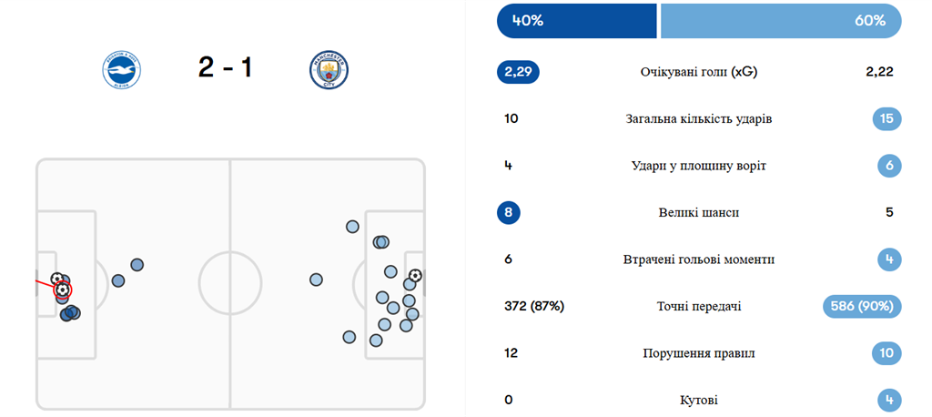 Тим не менш, в даному випадку не можна все списувати на жахливу форму Манчестер Сіті, адже це було б великою неповагою до тренерського штабу Брайтона на чолі з Фабіаном Гюрцелером. Саме своєчасні та логічні заміни відіграли свою величезну роль у цій перемозі "чайок".
