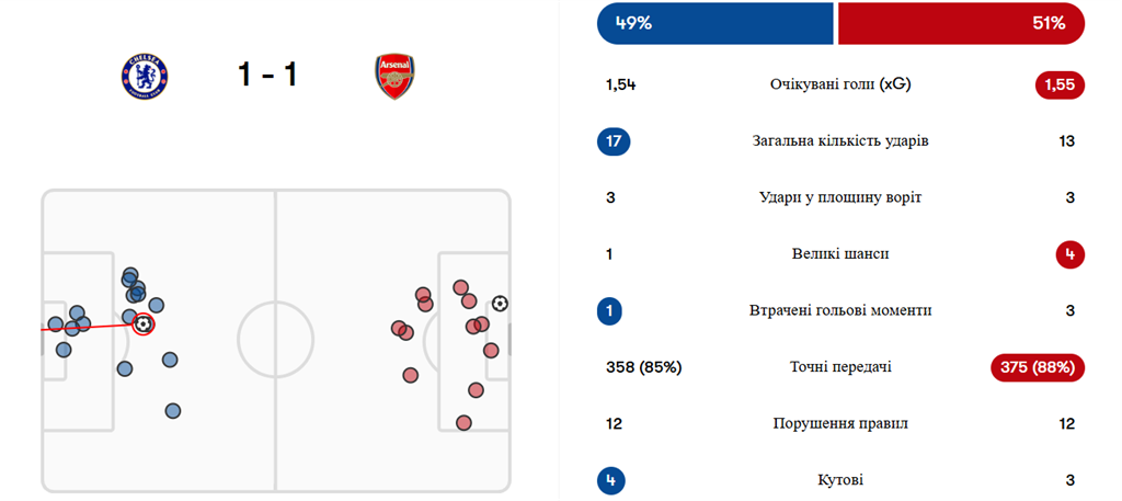 Втім, уже через десять хвилин організована оборона Арсеналу припустилася однієї з небагатьох помилок у цій зустрічі, залишивши Педру Нету на вигідній ударній позиції: після виходу Михайла Мудрика португалець перемістився на рідний правий фланг, і, можливо, це могло збентежити "канонірів". Згодом сильнішу кінцівку продемонстрували гравці Арсеналу, але, думаю, всі погодяться, що цей матч міг завершитися на користь кожної зі сторін, а нічия, з урахуванням усіх факторів, є закономірним результатом.